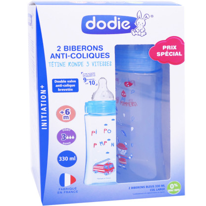 Les biberons anti-coliques Initiation+ de DODIE discount, les biberons au plus proche de l’allaitement maternel dans votre parapharmacie en ligne à prix discount, pour les tout-petits de plus de 6 mois. 2 biberons bleus