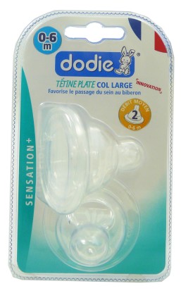 Les produits Dodie offrent aux bébés les meilleurs produits pour leur nutrition et leur confort et des produits aux mamans pour leur confort d'allaitement, de conservation et de stérilisation. Les tétines en silicone extra-souples débit 2 (moyen) plates ont la même forme et la même douceur que le sein de la maman avec une base élargie pour le plus grand confort de bébé lors du repas ressemblant à l’allaitement au sein. Sa technologie bénéficie d’une double valve intégrée à la tétine qui limite les coliques, les régurgitations et l’aérophagie en faisant circuler l’air régulièrement dans le biberon. Les tout-petits passeront facilement du sein au biberon tout en retrouvant les sensations de la douceur de la maman. Les tétines sont compatibles avec les biberons Initiation et Evolution de DODIE.