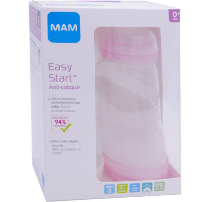 MAM développe depuis 35 ans des produits de puériculture uniques, tant par leur design que par leur fonctionnalité, afin de favoriser le développement des jeunes enfants et répondre aux exigences de leur parents. Chaque produit est conçu en partenariat avec des professionnels du monde médical, pédiatrique et scientifique : médecins, sages-femmes, psychologues du développement, designers et experts en technologie, afin que tous les bébés démarrent la vie du bon pied. Le biberon Easy Start Anti-coliques MAM, en plastique incassable, qui offre une bonne prise en main, est ultra-fonctionnel avec ses larges ouvertures qui permettent un dosage facile du lait et un nettoyage efficace et son autostérilisation. Il possède une base aérée brevetée qui permet de limiter le risque de coliques et de régurgitations en laissant bébé boire à son rythme. Sa tétine SkinSoft à débit 3 permet de laisser passer le liquide épais. Elle est formulée à base de silicone ultra-douce, avec une forme légèrement aplatie qui rappelle instinctivement le sein, facilitant ainsi la prise de la tétine par Bébé. Ce biberon possède également un capuchon anti-fruite et gradué très pratique pour garder la tétine toujours propre en déplacement, et doser de petites quantités.