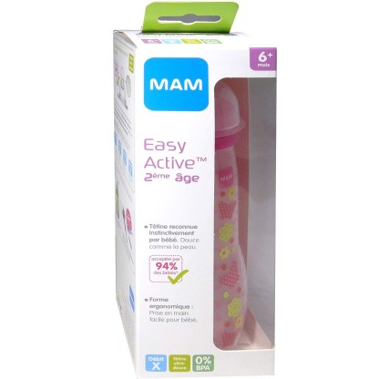 MAM développe depuis 35 ans des produits de puériculture uniques, tant par leur design que par leur fonctionnalité, afin de favoriser le développement des jeunes enfants et répondre aux exigences de leur parents. Chaque produit est conçu en partenariat avec des professionnels du monde médical, pédiatrique et scientifique : médecins, sages-femmes, psychologues du développement, designers et experts en technologie, afin que tous les bébés démarrent la vie du bon pied. Le biberon Easy Active 2ème âge MAM de 330 ml, en plastique incassable, qui offre une bonne prise en main, est ultra-fonctionnel avec ses larges ouvertures qui permettent un dosage facile du lait et un nettoyage efficace. Sa tétine à débit X ultra-rapide permet de laisser passer le liquide épais. Elle est formulée à base de silicone ultra-douce, avec une forme légèrement aplatie qui rappelle instinctivement le sein, facilitant ainsi la prise de la tétine par Bébé. Ce biberon possède également un capuchon ati-fruite et gradué très pratique pour garder la tétine toujours propre en déplacement, et doser de petites quantités.