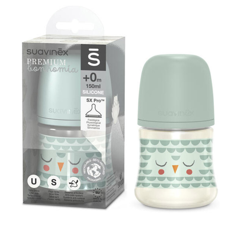 Le biberon Suavinex Bonhomia +0M 150 ml vert plume est en vente en ligne sur le site de votre parapharmacie à prix discount.