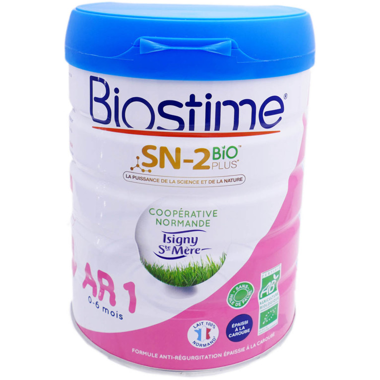 Les Laits infantiles bio de BIOSTIME sont des laits de suite ou de croissance bio sans huile de palme pour un sevrage tout en douceur. L’huile de palme remplacée par la crème de lait d’Isigny Sainte-Mère est naturellement plus riche en SN2-palmitate pour le respect de l’organisme fragile et la croissance des petits. Elaborés en Normandie ces laits qui viennent de vaches élevées en plein air et nourries avec de l’herbe des près et des fourrages biologiques, prennent soin de la santé des nourrissons en apportant les nutriments nécessaires. Le lait en poudre BIOSTIME SN-2 BIO PLUS AR1, est enrichi en caroube, un actif qui va s’épaissir dans l’estomac et favoriser la réduction des régurgitations du nourrisson au système digestif encore immature. Issu du lait de vache bio, il est composé de ferments lactiques bifidus, de fibres FOS, de DHA (oméga 3), de vitamines et minéraux (dont la vitamine D, A et C, le fer et le calcium), pour participer au bon développement de bébé de 0 à 6 mois.