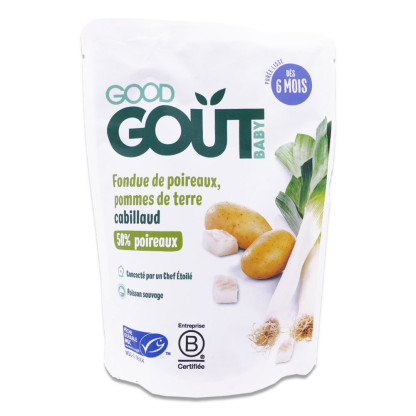 Petit Plat Fondue de Poireau Pommes de terre Cabillaud discount de GOOD GOUT, démarrer la diversification alimentaire en douceur dans votre parapharmacie en ligne à prix discount, avec ce repas savoureux Bio pour faire découvrir de nouvelles saveurs aux bébés, dès 6 mois.