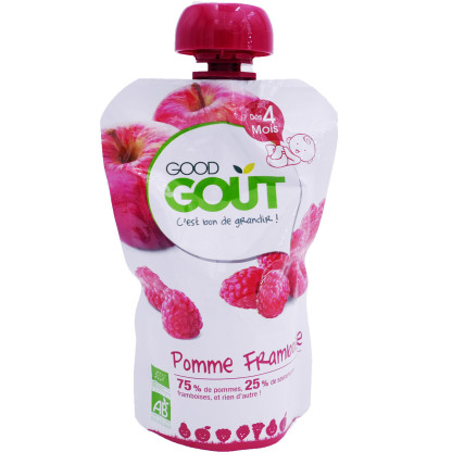 Purée de Fruits Bio discount de GOOD GOUT, démarrer la diversification alimentaire en douceur dans votre parapharmacie en ligne à prix discount, avec cette gourde au bon fruit gourmands pour faire découvrir de nouvelles saveurs aux bébés, dès 4 mois Pomme Framboise