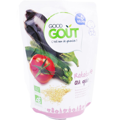 Découvrez la nouvelle marque française d’alimentation biologique sans produits chimiques ni pesticides ni OGM, à base de fruits et de légumes savoureux : GOOD GOUT. Spécialisée dans la conception de produits délicieux, GOOD GOUT vous assure qualité nutritionnelle, saveurs naturelles et plaisirs gustatifs pour régaler les enfants dès le plus jeune âge ! Lorsque vient l’âge de la diversité alimentaire, Bébé est avide de nouvelles saveurs et de textures différentes. Le Petit Plat Ratatouille Quinoa qui ne contient pas d’ingrédients nocifs pour les enfants, régaleront les papilles des plus jeunes ! Avec un mélange de légumes bios (courgettes, aubergines, tomates) concocté par un chef, accompagné de quinoa bio pour un peu de croquant, et un soupçon d’oignon bio et d’huile d’olive bio, ce petit plat gourmand 100% Bio plaira aux enfants ! Ingénieux, le sachet se chauffe au micro-ondes et son format permet de l’emporter partout.