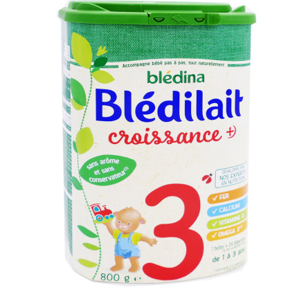 Le laboratoire BLEDINA a conçu des produits d’alimentation infantile à base d’ingrédients issus de champs et de vergers préservés aux contrôles stricts. Sans colorant ni conservateur ajouté ces laits en poudres favorisent le bon développement des bébés. Blédilait Croissance 3 est un lait en poudre spécialement formulé pour l’alimentation des nourrissons de 12 mois à 3 ans qui ne présentent pas de troubles particuliers, en relais de l’allaitement maternel, et qui accompagne la diversification alimentaire. Ce lait est conçu pour prolonger les bienfaits du lait maternel et apporter aux nourrissons tous les éléments pour leur croissance harmonieuse. Riche en DHA (oméga 3), fibres FOS/GOS, minéraux (fer, calcium) et vitamines (A, C, D), il contribue au bon fonctionnement du système immunitaire, augmente la vitalité pour que bébé ne soit pas fatigué, et participe au bon développement osseux en fixant la vitamine D sur les os pour une croissance harmonieuse des bébés. Sans arôme et sans conservateur