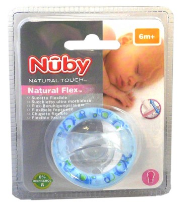 Sucette Natural Flex de NUBY, la sucette qui apaise et rassure les bébés dès 6 mois, tout en respectant le développement de la bouche.