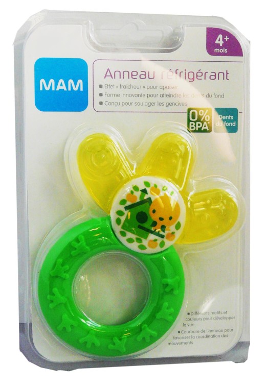 MAM développe depuis 35 ans des produits de puériculture uniques, tant par leur design que par leur fonctionnalité, afin de favoriser le développement des jeunes enfants et répondre aux exigences de leur parents. Chaque produit est conçu en partenariat avec des professionnels du monde médical, pédiatrique et scientifique : médecins, sages-femmes, psychologues du développement, designers et experts en technologie, afin que tous les bébés démarrent la vie du bon pied. L’anneau réfrigérant de dentition MAM est spécialement conçu pour soulager les gencives de bébé lors des premières poussées dentaires. Cet anneau ludique et coloré possède une surface munie de 5 textures différentes pour procurer à la fois un massage apaisant et favoriser le mécanisme de mastication en accompagnant le développement des mâchoires. Sa forme courbe est totalement adaptée à la bouche et aux mains de bébé. L’anneau contient de l’eau purifiée et se place au frais pour un effet réfrigérant encore plus apaisant.