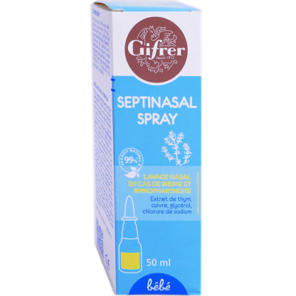 Depuis 1912, le laboratoire GIFRER développe des produits de santé simples et reconnus, gages d’authenticité, de qualité et de tradition pour accompagner la famille au quotidien dans sa quête de bien-être. Le Spray Septinasal Bébé de Gifrer, est un dispositif médical composé de thym, de glycérol et de cuivre, spécialement formulé pour diminuer l’obstruction nasale et l’inflammation, faciliter l’évacuation des mucosités, rétablir le confort respiratoire de bébé en cas de rhume et rhinopharyngite par ses propriétés antiseptiques et anti-inflammatoires. Lire attentivement les instructions figurant sur l’étui. Sans gaz propulseur.