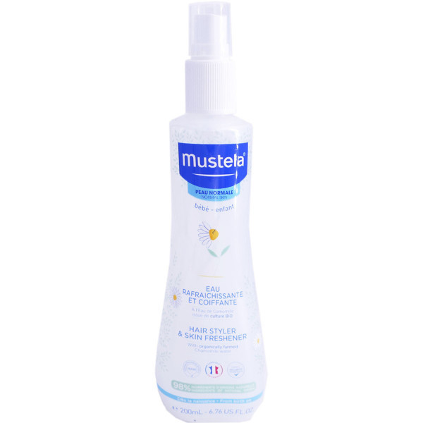 La gamme de soins quotidiens MUSTELA Bébé est composée de produits conçus pour préserver le capital cellulaire des nourrissons grâce à un actif biomimétique exclusif : le Perséose d’Avocat®. L’Eau Rafraîchissante et Coiffante est une eau de toilette multi-usage qui peut s’utiliser pour rafraîchir, parfumer ou coiffer bébé. Composée d’eau de Camomille bio, l’eau coiffante prend soin de la peau et des cheveux en les protégeant. Après le soin, la peau et les cheveux sont doux et délicatement parfumés et frais pour le plus grand confort de bébé, les cheveux sont brillants et facile à coiffer. Hypoallergénique, testé sous contrôle dermatologique. Haute tolérance