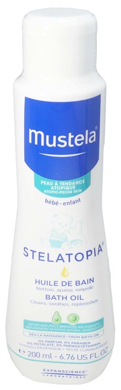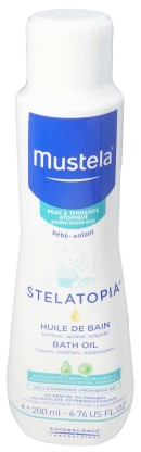 Dans les années 50, un produit totalement innovant révolutionne les soins bébé : un produit 2en1 nettoyant et adoucissant à l’odeur évocatrice : le lait emblématique MUSTELA. 60 ans plus tard, MUSTELA propose toujours des produits sûrs, efficaces, aux formules les plus naturelles possibles pour protéger la peau sensible des bébés. La gamme de soins MUSTELA Dermo-pédiatrie est composée de produits conçus avec des pédiatres et des dermatologues pour répondre aux troubles cutanés des peaux fragiles et encore immatures des tout-petits. Les soins STELATOPIA répondent aux besoins spécifiques des peaux sèches à tendance atopiques. L’huile pour le bain nettoie tout en douceur la peau sèche de nourrisson, du bébé et de l’enfant pendant le bain, nourrit et hydrate intensément et en profondeur, et apaise de tout inconfort. Elle protège la peau fragile des tout-petits en reformant le film protecteur par l’apport de lipides et luttant contre les facteurs irritants qui sont la cause des rougeurs et irritations tels que l’eau calcaire en renforçant ses défenses naturelles, respecte et renforce le film protecteur de la peau fragile et sèche, par sa base lavante sans savon et son pH neutre, sa richesse agents tensioactifs doux, à l’oléodistillat de tournesol, à l’extrait de camomille ainsi qu’à sa richesse en huile d’avocat naturelle brevetée. Sa texture huile qui se rince facilement, enveloppe la peau de bébé pour la laisser très douce. Après la toilette, la peau de bébé est propre et très douce.