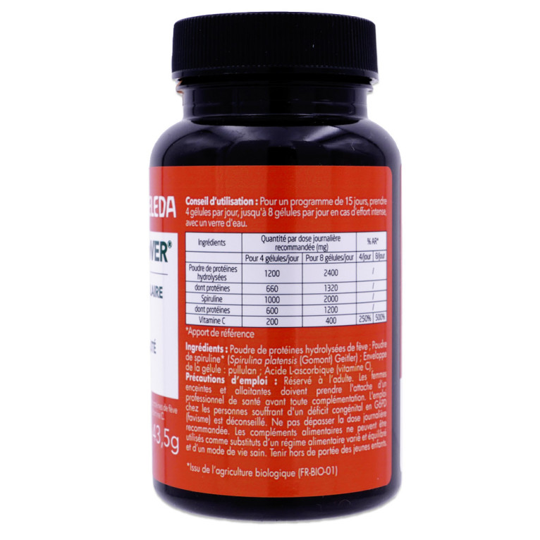 Poudre de protéines hydrolysées de fève ; Poudre de spiruline bio *(Spirulina platensis (Gomont) Geitler) ; Enveloppe de la gélule : pullulan ; Acide L-ascorbique (vitamine C).*Issu de l'agriculture biologique (FR-BIO-01)