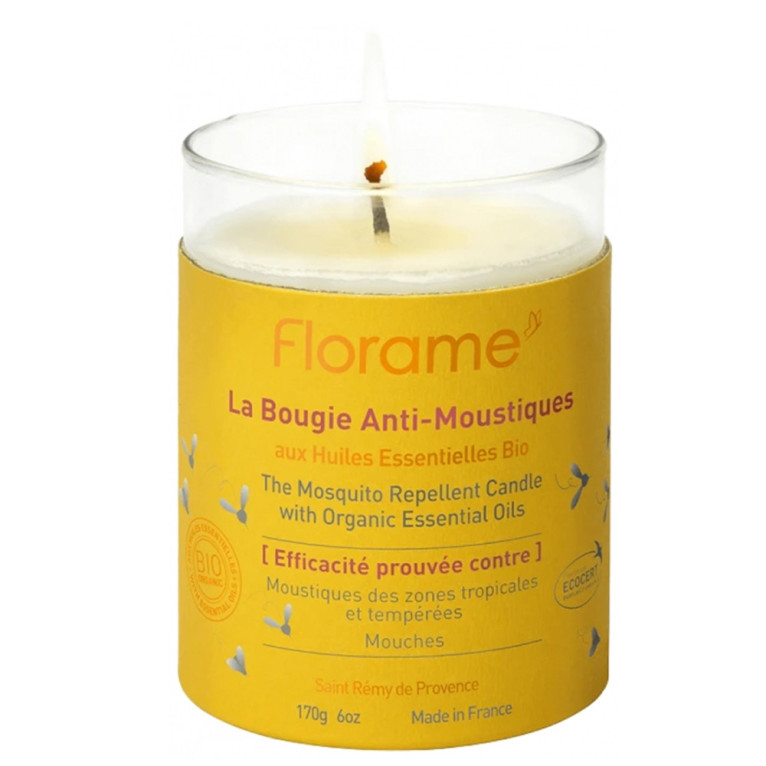 La gamme anti-moustiques est composée de répulsifs aux ingrédients naturels et biologiques pour éloigner mouches et moustiques dans les zones tempérées et tropicales. La bougie composée d’huiles essentielles bio 100% pures et naturelles (Citronnelle, Menthe Poivrée, Palmarosa, Eucalyptus, et Lemongrass) et d’huile végétale d’andiroba bio, éloigne dès que la bougie est allumée, les moustiques de plusieurs espèces (Standard Culex pipiens, Méditerranéen Aedes aegypti, Tropical Anopheles stephensi) et les mouches (Musca domestica). D’une durée d’environ 30 heures lorsque la bougie est allumée, elle éloignera les insectes et protègera des piqûres et parfumera l’air ambiant d’un parfum d’été léger et agréable.