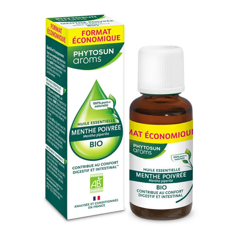 Menthe Poivrée Digestion des laboratoires PHYTOSUN AROMS, est une huile essentielle à base de menthe poivrée, qui aide aux fonctions digestives et au fonctionnement normal du système digestif.