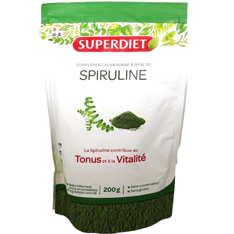 Le laboratoire SUPER DIET propose Spiruline le complément alimentaire sous forme de poudre d’origine marine, la spiruline qui est une algue bleue microscopique d’eau douce est riche en protéines acides aminés essentiels, vitamines, sels minéraux et oligo-éléments. La spiruline aide à soutenir la vitalité de l'organisme et contribue à la récupération musculaire après l'effort. Elle contribue aussi à la résistance de l'organisme.
