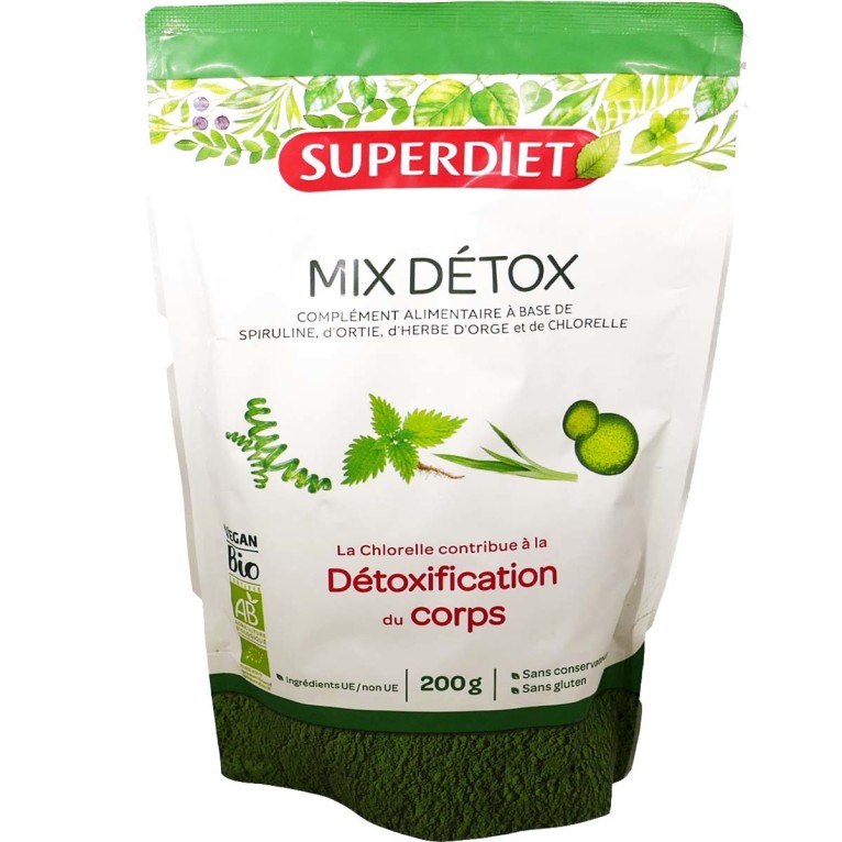 MIX DETOX Bio Poudre discount de SUPERDIET, un complément alimentaire en poudre à base de spiruline, d'ortie, d'herbe d'orge et de chlorelle qui contribue à la détoxification du corps dans votre parapharmacie en ligne à prix discount.