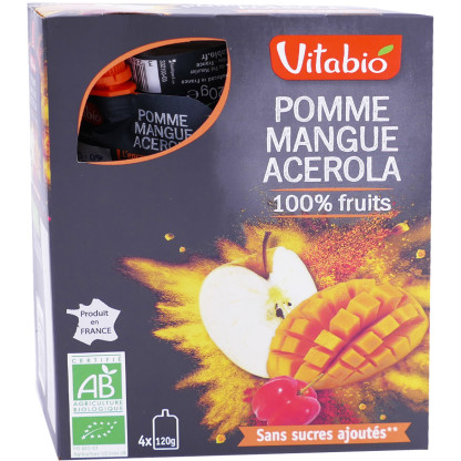 L’encas Pomme Mangue Acérola Bio de VITABIO à prix discount dans votre parapharmacie en ligne, la force des fruits en gourde !