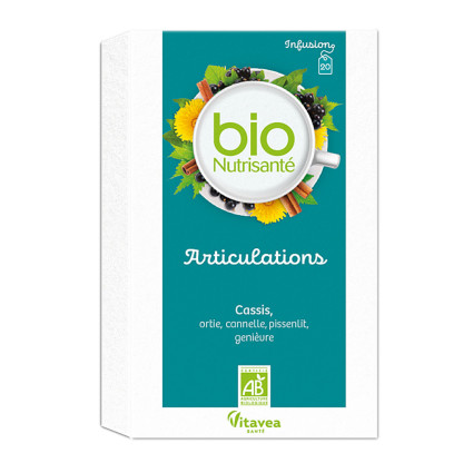 L’infusion NUTRISANTE Bio Articulations Cassis des Laboratoires NUTRISANTE combine le Cassis qui aide à entretenir les articulations et facilite la mobilité articulaire avec la cannelle qui a des propriétés antioxydantes. L'ortie, le pissenlit et le genièvre complètent la composition de cette infusion à déguster à n'importe quel moment de la journée.