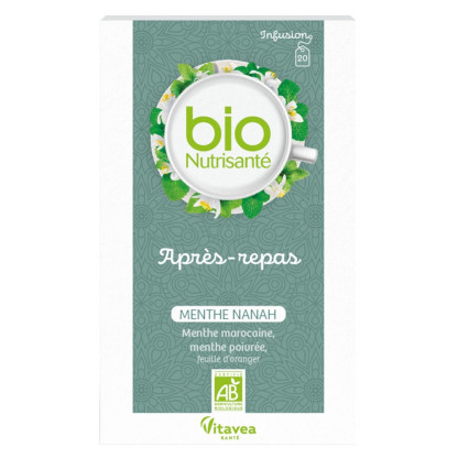 L’infusion Après-repas Bio Menthe Nanah discount de NUTRISANTE, une délicieuse infusion conditionnée sous forme de sachets non blanchis au chlore, sans agrafe et sans colle disponible dans votre parapharmacie en ligne à prix discount.