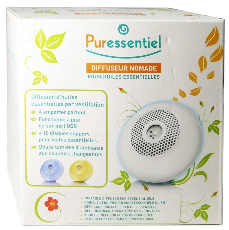 Le laboratoire PURESSENTIEL conçoit des produits d’aromathérapie et de cosmétique naturels et bio à base d’huiles essentielles naturelles et d’actifs bio pour retrouver le bien-être au quotidien. Le diffuseur d’huiles essentielles nomade de PURESSENTIEL disperse les huiles essentielles en silence par ventilation. Lorsque le diffuseur est branché sur un port USB d’un ordinateur ou fonctionne avec les piles (non fournies), les huiles essentielles se dispersent dans la pièce (bureau, hôtel, maison, cabinet médical…). Le diffuseur très silencieux peut être utilisé dans une chambre pour diffuser des huiles apaisantes afin de s’endormir paisiblement et passer des nuits tranquilles. Il diffusera ces huiles pendant 2 heures avant de s’éteindre automatiquement avec des intervalles de 10 minutes de diffusion et 20 minutes de pause. Les disques vendus avec l’appareil permettent d’être imbibé de 3 à 5 gouttes d’huiles essentielles ou de mélanges d’huiles. Pour une ambiance colorée, le diffuseur projette une douce lumière avec différentes couleurs et peuvent être alternées (bleu, rose, jaune). Pratique par son petit format, le diffuseur nomade s’emporte partout et peut être utilisé chez soi, au bureau, en salle d’attente… pour un parfum d’ambiance selon ses envies.