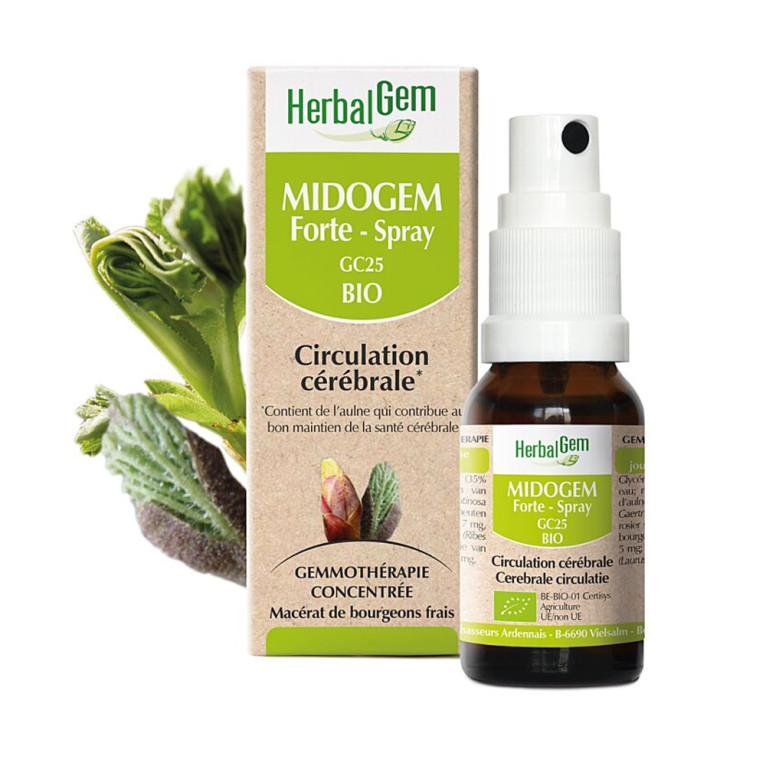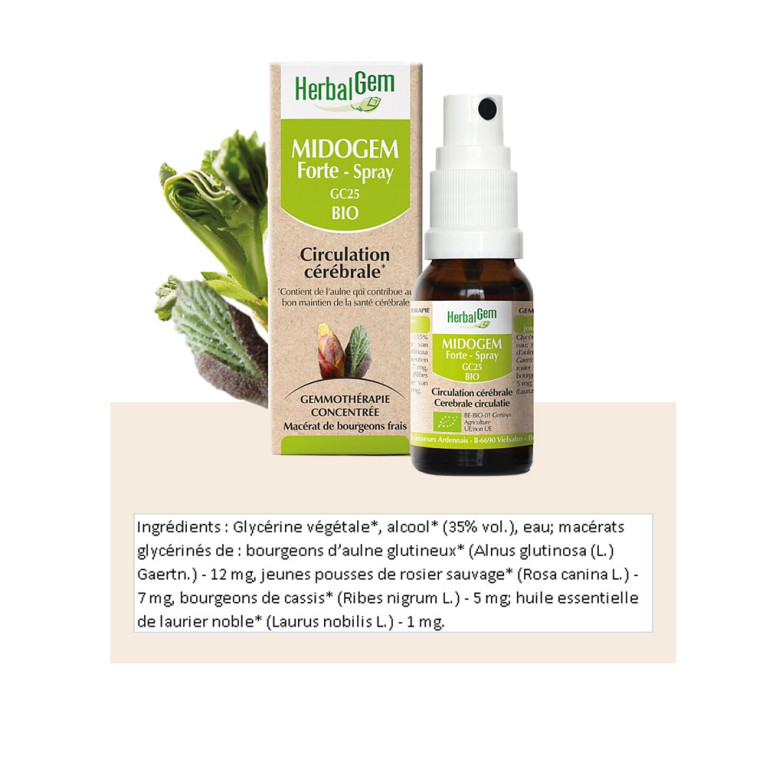 Découvrez le spray HERBALGEM BIO MIDOGEM FORTE GC25, un produit de qualité du laboratoire Herbalgem. Ce spray contient des composants naturels tels que des bourgeons d’aulne glutineux et de cassis, des jeunes pousses de rosier sauvage et de l’huile essentielle de laurier. L'aulne permet de soutenir la bonne fonction du système circulatoire au niveau du cerveau.