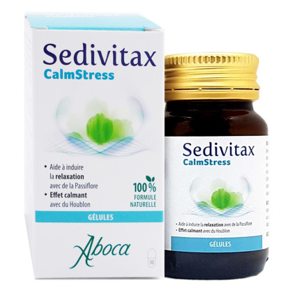 SEDIVITAX CalmStress est un complément alimentaire conditionné en gélules à base d’extraits de plantes : passiflore, houblon, jujubier, aubépine. Le concentré total de passiflore va favoriser la relaxation ; le houblon va procurer un effet calmant. Le concentré total de jujubier et l’extrait d’aubépine complètent la formule. 100% naturel SEDIVITAX CalmStress ne contient ni substances de synthèse, semi-synthèse ou génétiquement modifiées.