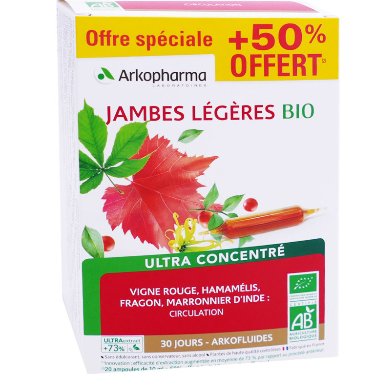 ARKOFLUIDES BIO JAMBES LEGERES 30 JOURS ARKOPHARMA au procédé ULTRAextract®, une innovation qui allie performance et respect de la nature ; ULTRAextract® repose sur un procédé inédit d’extraction des plantes assistée par ultrasons, qui permet d’aller puiser au cœur de la plante ses composés actifs, sans utilisation de solvant de synthèse. La Vigne rouge (Vitis vinifera). La feuille de Vigne rouge possède des propriétés bénéfiques sur la circulation et contribue à diminuer la sensation de jambes lourdes et fatiguées ; Le Fragon (Ruscus aculeatus). Originaire des régions d’Europe centrale et méridionale, le Fragon puise l’ensemble de ses propriétés dans ses parties souterraines : la racine et le rhizome. Il aide à soutenir la circulation et permet de diminuer la sensation de jambes lourdes ; L’Hamamélis (Hamamelis virginiana). L'Hamamélis se révèle intéressant en phytothérapie où il est traditionnellement utilisé pour ses bienfaits sur le système circulatoire en protégeant notamment les petits vaisseaux et les capillaires et en améliorant le retour veineux ce qui permet de retrouver une sensation de jambes légères ; Le Marronnier d’Inde (Aesculus hippocastanum). Originaire des Balkans comme son nom ne l’indique pas, le Marronnier d’Inde est traditionnellement utilisé pour le bien-être circulatoire.