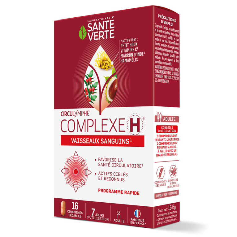 SANTE VERTE Circulymphe complexe H est un complément alimentaire en comprimés. Sa formule associe des extraits sec de feuilles d'Hamamelis, de Marronnier d'Inde et de Cassis. La vitamine C présente dans ce complément alimentaire contribue à la formation normale de collagène utile pour le fonctionnement normal des vaisseaux sanguins. Enfin la formule est complétée par du petit houx qui participe à soutenir la circulation sanguine.