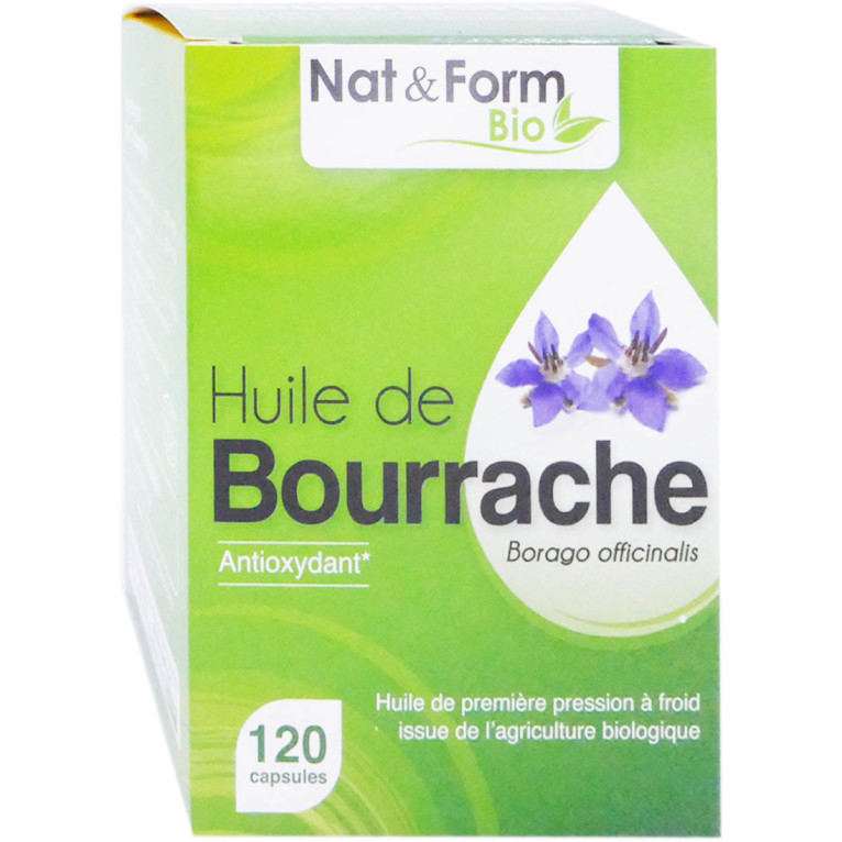 Bourrache bio de Nat&Form est un complément alimentaire contenant de l’huile de Bourrache riche en acides gras essentiels polyinsaturés et notamment en acide gamma-linoléique.La bourrache poussant dans les régions méditerranéennes est caractérisée par ses magnifiques fleurs en forme d'étoile de couleur bleue.