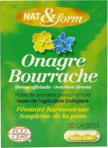 Onagre et bourrache bio de Nat&Form est un complément alimentaire conditionné sous forme de capsules à avaler.L’huile d’Onagre et l’huile de Bourrache contenues dans celles ci sont très riches en acides gras essentiels polyinsaturés notamment en acide gamma-linoléique. L'onagre est originaire d'Amérique du Nord, elle possède de grandes fleurs jaunes que l'on retrouve sur le bord des routes et les terrains non cultivés.Cette primevère du soir est une fleur qui profite de la nuit pour s'épanouir.La bourrache poussant dans les régions méditerranéennes est caractérisée par ses magnifiques fleurs en forme d'étoile de couleur bleue.