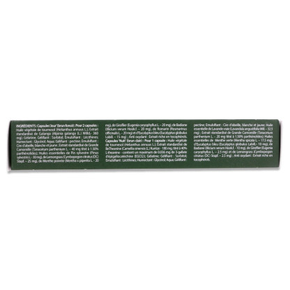 Mode d'emploi : Prendre 1 capsule le matin et 1 capsule le soir avec un grand verre d'eau. Avertissements : Ne pas utiliser chez les enfants de moins de 6 ans, les femmes enceintes, allaitantes, les personnes ayant des antécédents de convulsion ou épileptiques, les personnes asthmatiques ou allergiques aux huiles essentielles. Ne pas dépasser la dose journalière recommandée. Déconseillé pour les femmes enceintes et allaitantes. Conserver hors de portée des jeunes enfants.