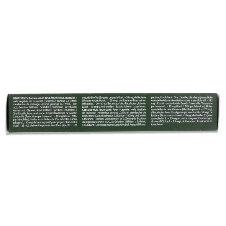 Capsules Jour (brun foncé) : Pour 2 capsules : huile végétale de tournesol (helianthus annuus L.) ; extrait standardisé de galanga (alpinia galanga (L.) Willd, 360mg) ; gélatine ; gélidifiant ; sorbitol ; émulsifiant ; lécithines ; humectant ; glycérol ; aqua ; gélifiant : pectine ; émulsifiant : cire d'abeille, blanche et jaune ; extrati standardisé de grande camomille (tanacetum parthenium L. - 40mg titré à 1,50% parthénolides) ; huiles essentielles de pin sylvestre (pinus sylvestris L - 30mg), de lemongrass (cymbopogon citratus (DC) stapf. - 25mg), de menthe poivrée (mentha x piperita L. - 20mg), de giroflier (eugenia caryophyilus L. - 20mg), de badiane (illicium verum hook.f. -20mg), de romarin (rosmarinus officinalis L. - 20mg) et d'eucalyptus bleu (eucalyptus globulus labill. - 15mg) ; anti oxydant : extrait riche en tocophérols.
