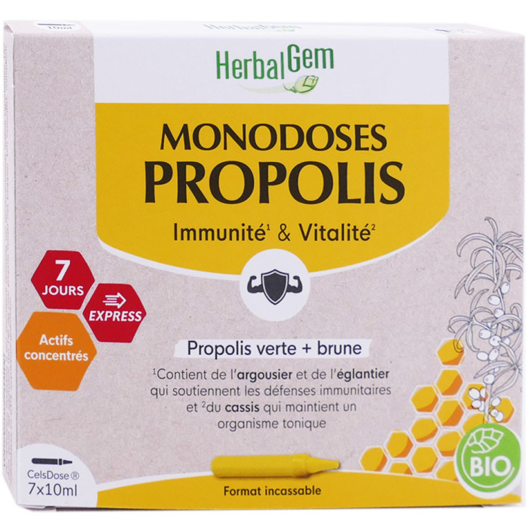 Monodoses Propolis Bio discount d’HERBALGEM, le complément alimentaire en ampoules incassables à base de propolis et extraits de plantes, dans votre parapharmacie en ligne à prix discount.