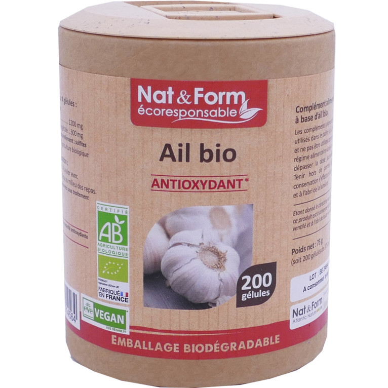 AIL Bio conditionné en gélules, est un complément alimentaire composé de poudre d’ail bulbe biologique.L'ail soutient le maintien de la santé cardiaque et le taux normal de cholestérol.