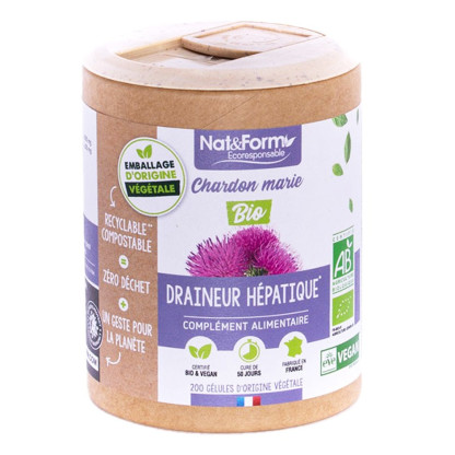 Chardon Marie bio de Nat&Form est un complément alimentaire sous forme de gélules contenant du chardon marie. Le Chardon Marie est une plante utilisée depuis l’Antiquité pour ses bienfaits sur le système hépato-biliaire : il contribue au maintien de la fonction hépatique et favorise en outre la digestion et l'épuration de l'organisme.De plus, il est hépatoprotecteur et régénérateur hépatique.