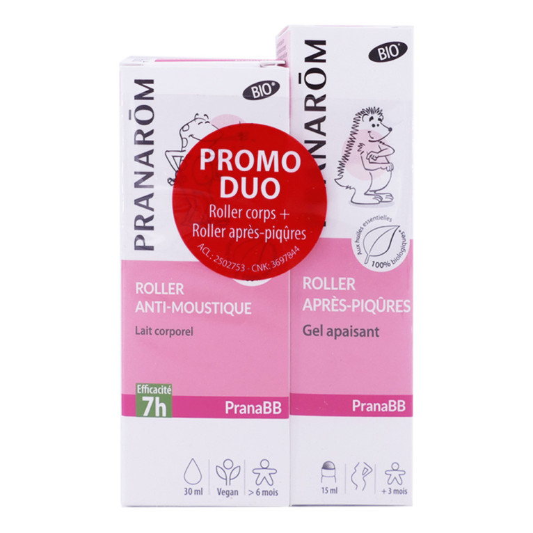 Le lot PRANABB discount de PRANAROM, 2 soins sous forme pratique à base d’huiles essentielles pour protéger la peau des bébés des piqûres de moustiques et apaiser les démangeaisons : Roller Anti-moustiques Lait corporel PranaBB (30ml) et Roller après-piqûres Gel apaisant PranaBB (15ml), à prix discount dans votre parapharmacie en ligne