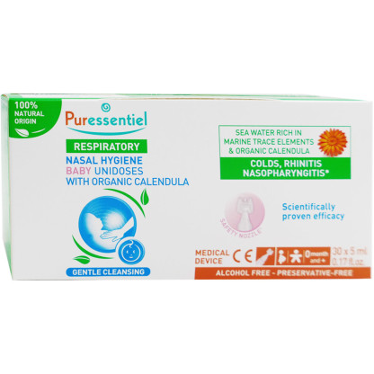 PURESSENTIEL Respiratoire Hygiène Nasale Bébé discount, des unidoses pour nettoyer au quotidien le nez bouché de bébé lors de rhumes, rhinites et rhinopharyngites, dans votre parapharmacie en ligne à prix discount. Dès la naissance