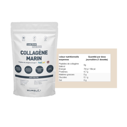 Découvrez la gamme HUMBLE, connue pour ses produits de qualité à base d'ingrédients naturels. Ce complément alimentaire se présente sous forme de poudre à diluer dans un verre d’eau, facile à intégrer à votre routine quotidienne. Le HUMBLE + COLLAGEN MARIN NEUTRE est un complément alimentaire à base de peptides de collagène marin de type 1 Naticol, apprécié pour son intérêt dans la beauté de la peau, des ongles et des cheveux. N'hésitez plus et offrez-vous ce cocktail de bienfaits pour une peau éclatante et des cheveux forts.