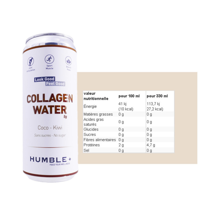 Issu de la marque HUMBLE, ce collagen water est formulé avec de la noix de coco et du kiwi pour une saveur exotique et rafraîchissante. En plus de son goût délicieux, ce produit contient seulement 4 ingrédients, dont du collagène marin Naticol, un ingrédient largement utilisé dans les produits de beauté pour la peau et dans les compléments destinés au confort articulaire. Profitez de ce collagen water au quotidien dans le cadre d’une alimentation variée et équilibrée. N'attendez plus pour l'ajouter à votre panier !4 Ingrédients 100% naturels : Eau gazéifiée, 5g de collagène marin hydrolysé Naticol®, arômes naturels, jus de citron concentré.