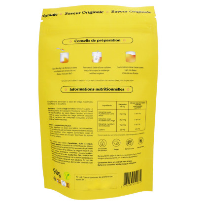 Complément alimentaire en poudre à base d’extraits de Lion’s Mane, Chaga, Cordyceps et caféine. Sans sucres, sans gluten, sans lactose et 100% naturel.