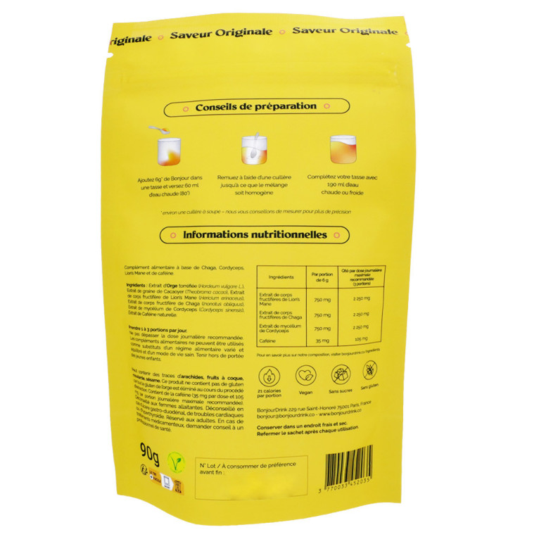 Extrait d’Orge torréfiée (Hordeum vulgare) ; Extrait de graine de Cacaoyer (Theobroma cacao) ; Extrait de corps fructifère de Lion’s Mane (Hericium Erinaceus) ; Extrait de corps fructifère de Chaga (Inonotus Obliquus) ; Extrait de corps fructifère de Cordyceps (Cordyceps Sinensis); Extrait de caféine naturelle issu du café vert, riche en bioactifs. (35mg de caféine soit 5 fois moins qu'un café traditionnel). Sans gluten.