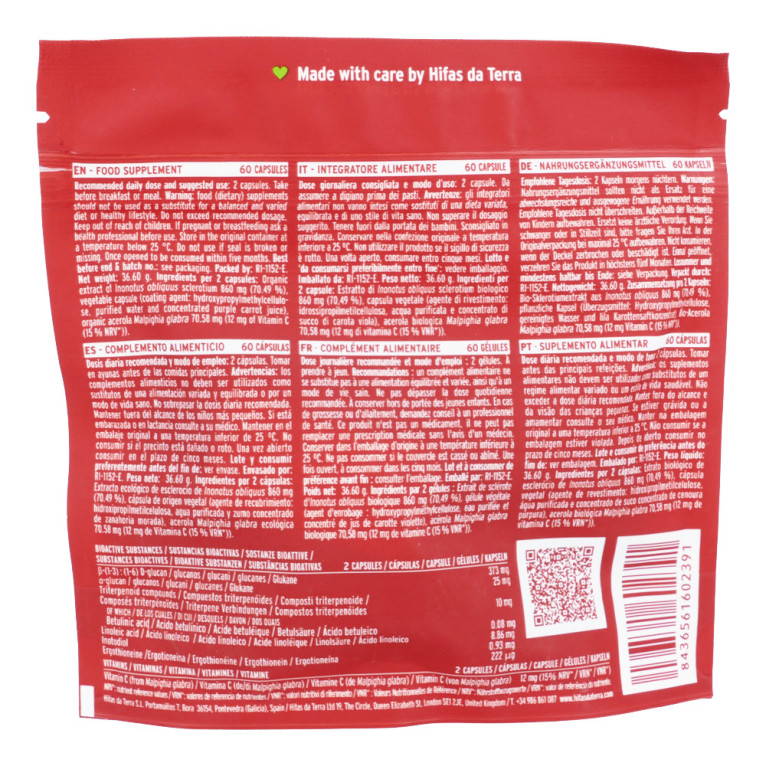 Chaque gélule contient 430 mg d’extrait biologique de sclérote d'Inonotus obliquus et 35,29 mg d’acérola biologique (Malpighia glabra) — soit 6 mg de vitamine C (7,5 % VNR*). Gélule 100 % végétale (colorants naturels issus de jus concentré de carotte).
