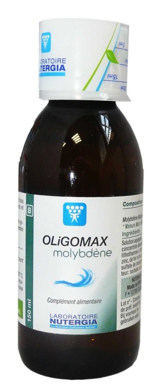 Oligomax Molybdène des laboratoires NUTERGIA, complément alimentaire sous forme de solution buvable, est composé d'eau de mer, d'oligoélements et de lithothamne qui est une algue rouge des profondeurs marines riche en minéraux . Sa formule est complétée en molybdène bio-disponible Oligomax Molybdène qui participe au métabolisme normal des acides aminés soufrés.