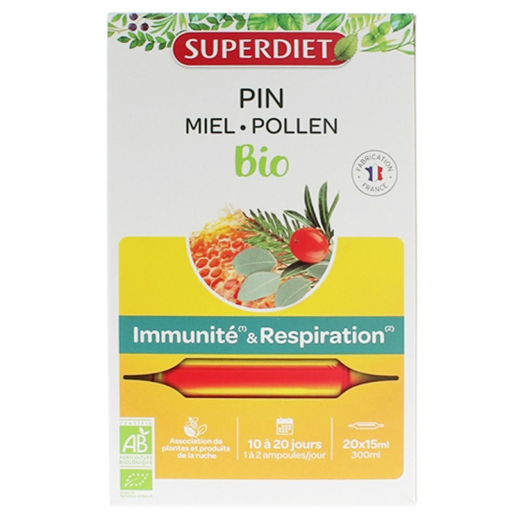 PIN MIEL POLLEN Bio discount de SUPERDIET un complément alimentaire sous forme d’ampoules à boire pure ou diluée dans un verre d’eau dans votre parapharmacie en ligne à prix discount, aux actifs 100% naturels.