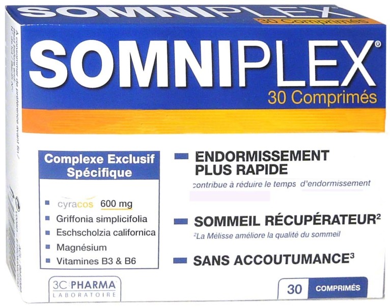 SOMNIPLEX® 3C pharma des laboratoires 3 Chênes est un complément alimentaire en comprimés. Sa formule est composée de mélatonine, d’un actif breveté le Cyracos issu de la mélisse, de pavot de Californie, et de la griffonia simplicifolia. Dans cette formule la mélisse aide à trouver un meilleur sommeil et est utilisée pour diminuer l'agitation. Enfin la formule est complétée par de la mélatonine qui contribue à réduire le temps nécessaire à l’endormissement.