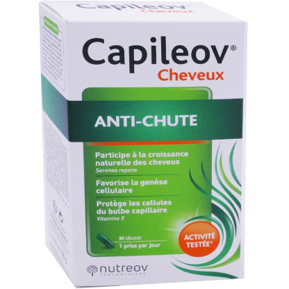 Capileov Cheveux Anti-Chute du laboratoire NUTREOV, est un complément alimentaire composé de vitamine B8 et du zinc, qui contribuent à protéger les cellules contre le stress oxydatif, et de palmier de Floride, qui participe à la croissance naturelle des cheveux. De la vitamine B6 vient s’ajouter à ce produit, et aide à la synthèse normale de la cystéine, composant majoritaire du cheveu.