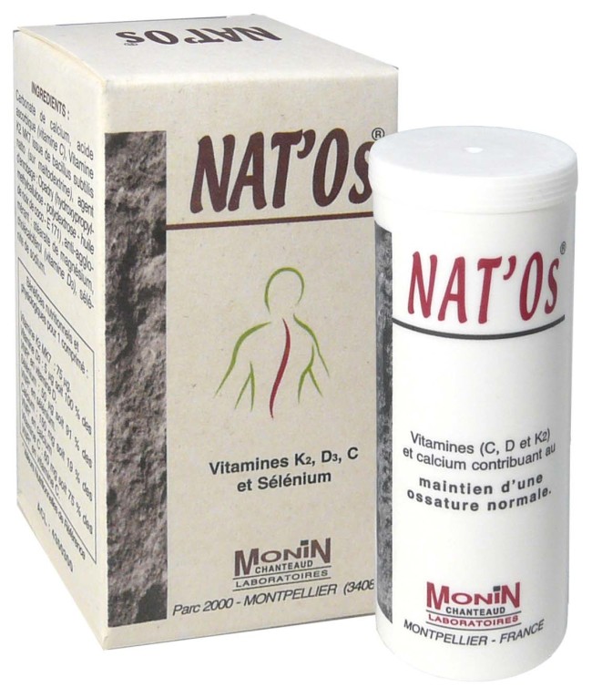 NAT’Os du laboratoire MONIN CHATEAUD, est un complément alimentaire à base de sélénium, qui participe à la protection des cellules contre le stress oxydatif, et de vitamine K2, qui contribue à maintenir une bonne ossature. Vient s’ajouter à ce complément alimentaire du calcium, nécessaire au maintien d’une ossature normale.