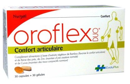 OROFLEX Duo Confort articulaire des laboratoires EVOLUPHARM est un complément alimentaire conditionné en capsules et gélules. Les capsules apportent des acides gras essentiels de type Oméga 3 (EPA 30/ DHA 20). Les gélules sont composées de bambou, reine des prés, Zinc et Cuivre. Le bambou favorise le confort articulaire, le zinc contribue à maintenir une ossature normale et le cuivre contribue au maintien de tissus conjonctifs normaux.