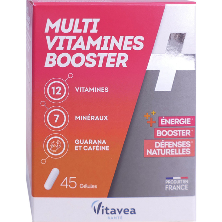Multi Vitamines Booster VITAVEA SANTE des laboratoires NUTRISANTE conditionné sous forme de gélules, est composé de Vitamines, minéraux, guarana et caféine. Les vitamines C, B2, B6, et B12 associées au magnésium et au fer permettent de réduire la fatigue, ces mêmes vitamines associées au cuivre et au manganèse favorisent un métabolisme énergétique normal. Une fois associées au magnésium et au cuivre. Les vitamines B2 B3 et B12 contribuent au fonctionnement normal du système nerveux. Les vitamines A, D, C, B6, B9, et B12 aident au fonctionnement normal du système immunitaire. La vitamine D contribue à maintenir une ossature normale. Enfin le cuivre le zinc mais également les vitamines E, C et B2 contribuent à protéger les cellules contre le stress oxydatif. Le guarana contribue à la vivacité d’esprit et à réduire la fatigue. La caféine participe à une bonne concentration, et augmente la vigilance.