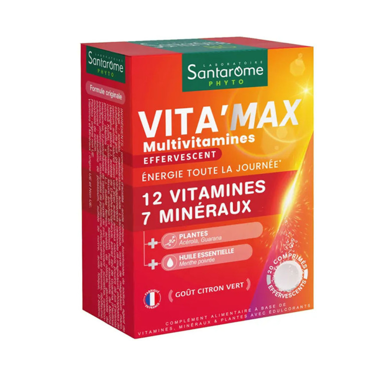 Santarome Vita'Max Multivitamines est un complément alimentaire proposé par le laboratoire Santarome, composé de 12 vitamines et 7 minéraux. Les vitamines B1, B2, B3, B5, B6, B8, B12, C ainsi que le Cuivre, Fer, Magnésium, Manganèse contribuent à un métabolisme énergétique normal. Les vitamines B2, B3, B5, B6, B12, C, le Fer et le Magnésium contribuent à réduire la fatigue. Ces comprimés effervescents au délicieux goût de citron vert sont formulés également avec de l'acérola qui est une source naturelle de vitamine C, et du guarana qui va aider à réduire la fatigue mentale.